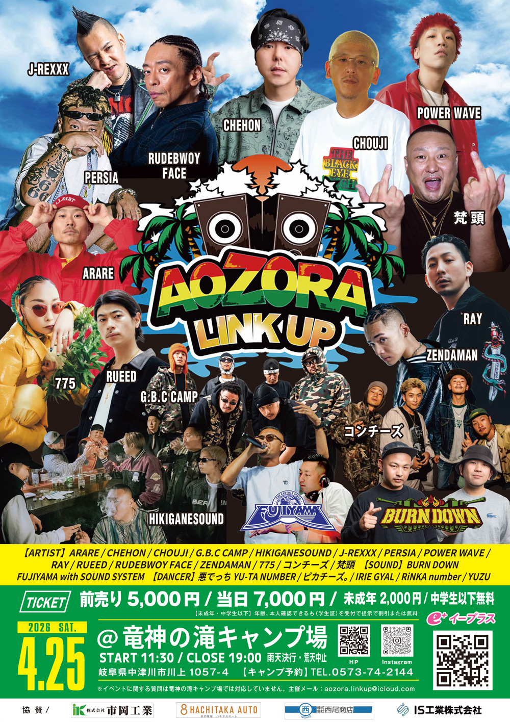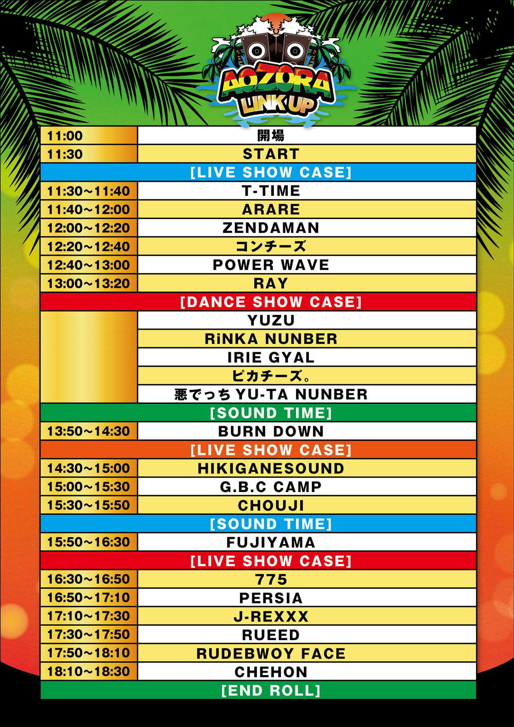 | 出演者 | 【ARTIST】 ARARE CHEHON CHOUJI G.B.C CAMP HIKIGANESOUND J-REXXX PERSIA POWER WAVE RAY RUEED RUDEBWOY FACE ZENDAMAN 775 コンチーズ 梵頭 【SOUND】 BURN DOWN FUJIYAMA with SOUND SYSTEM 【DANCER】 悪でっちYU-TA NUMBER ピカチーズ。 IRIE GYAL RiNKA number YUZU |